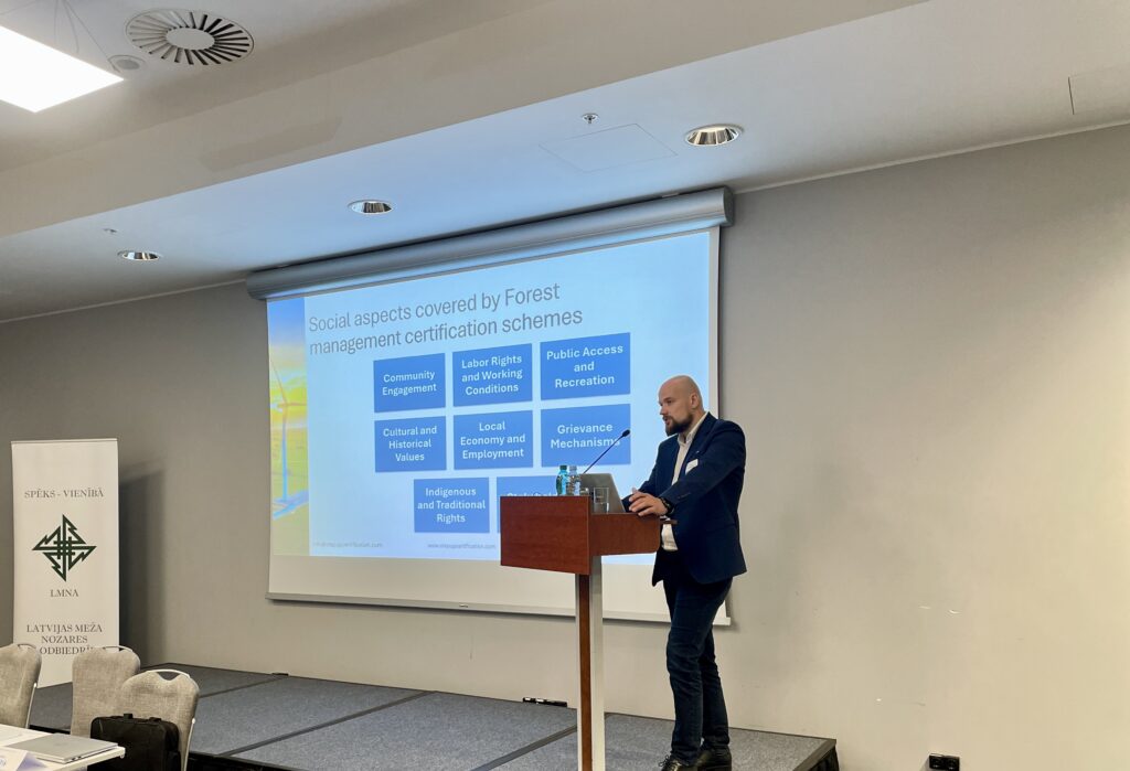 Seminārā Jānis Švirksts, “STEP UP Certification” dibinātājs, Latvijas mežu sertifikācijas padomes sertifikācijas eksperts, iepazīstināja ārvalstu pārstāvjus ar meža sertifikācijas lomu Latvijā. Viņš skaidroja, ka brīvprātīgie instrumenti, piemēram, PEFC un FSC sertifikācija, kalpo ne tikai vides, bet arī sociāli atbildīgas mežu apsaimniekošanas veicināšanai.