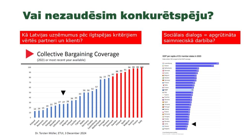 Latvijā koplīgumu pārklājums jau tagad ir viens no zemākajiem ES – aptuveni 22% nodarbināto (salīdzinājumam, ES vidēji ~60%). Tā vietā, lai vēl vājinātu koplīgumu lomu, būtu jāveicina to noslēgšana, kā to paredz gan ES direktīvas, gan Latvijas Satversmes 108. pants, kas nostiprina tiesības uz kolektīvo aizsardzību – sociālā dialoga pamatu.